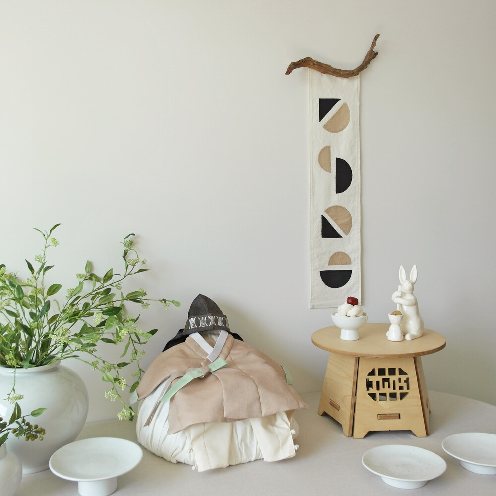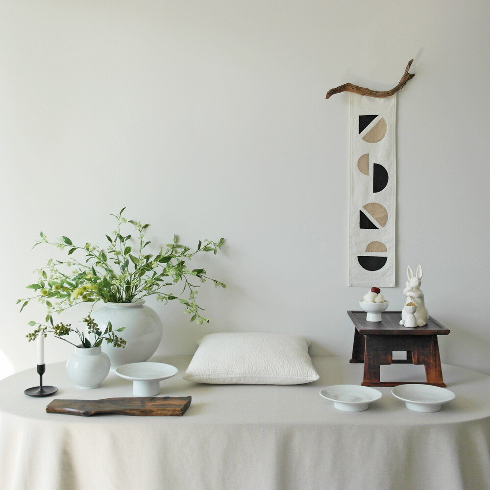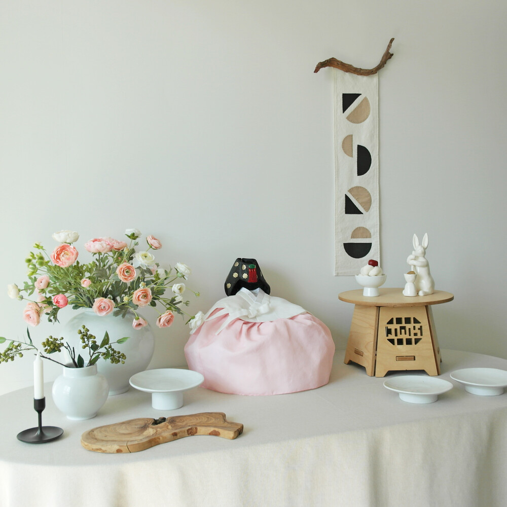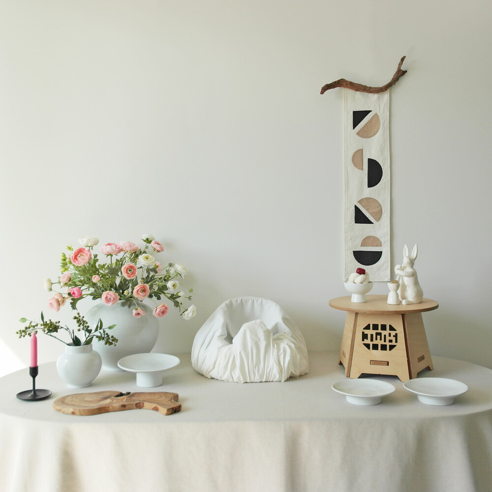 동그란 달항아리의 쉐잎을 더욱 돋보이게 해주는 네모의 역할 해주반. 다크 우드와 백자의 고매한 조합.
